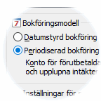 För att använda Periodiserad bokföring anges bokföringsmodellen Periodiserad bokföring i Inställningar för Bokföring. I detta sammanhang anges även Konto för förutbetalda kostnader och upplupna intäkter. Detta konto utgör ett uppsamlingskonto på balansrapporten för ej bokförda kostnader framåt i tiden. Om andra förutbetalda kostnader och upplupna intäkter registreras förutom de som registreras i samband med Periodiserad bokföring, kan det vara idé att använda två olika konton. Dels ett konto för manuell hantering samt ett eget konto för automatisk hantering. |