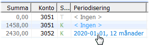 Periodiseringsdatum kommer att föreslås baserat på datum angivet i verifikationens huvud. Detta datum kan sedan förändras om konteringen ska kostnadsföras på en annan period. Om periodiseringsdatum förändras ska datum ligga inom innevarande räkenskapsår eller i annat registrerat räkenskapsår framåt i tiden. Periodiseringsdatum kan alltså inte anges tidigare än innevarande räkenskapsår. |