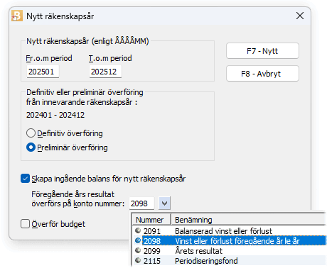 I denna bokslutsrutin skapas nytt räkenskapsår och utgående balanser kan överföras från innevarande år till ingående balans på det nya räkenskapsåret. Nytt räkenskapsår kan utföras flera gånger för ett och samma nya räkenskapsår och allt eftersom bokslutet blir klart kan nya överföringar göras.