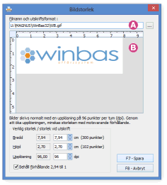En bild har bearbetats i ett bildhanteringsprogram där upplösningen är satt till 300 när detta stöds av det aktuella bildformatet. När bilden väljs in på blanketten måste då denna inställning också göras i Winbas för att utskriftsformatet ska bli samma som i bildhanteringsprogrammet eller layoutprogrammet. När ändringen har gjorts på blanketten kommer storleken i bredd och höjd vara 32 procent vid 300 dpi jämfört med 96 dpi (300 dividerat med 96).