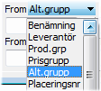 När en rubrik för alternativnummer väljs, som t.ex. EAN, OEM eller annan typ av kod eller märkning, kommer urvalet enbart att gälla produkter med nummer registrerade i intervallet för den definierade rubriken. När en rubrik har valts kan knappen vid fältet användas för att visa en lista över registrerade förekomster i positionen. |