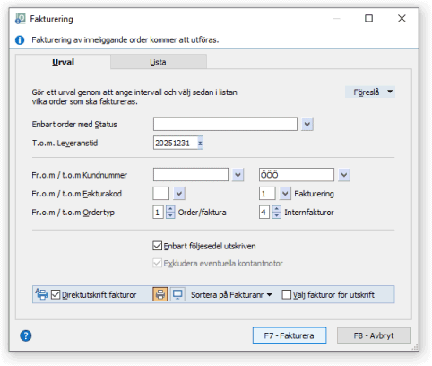 Intervallet bearbetar alla kunder med order med kundnummer inom det angivna intervallet. Man kan välja att fakturera en, flera eller alla kunder genom att ange Fr.o.m. kundnr och T.o.m. kundnr.
