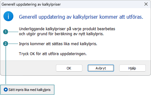 att produktens inpris uppdateras baserat på kalkylpriser.