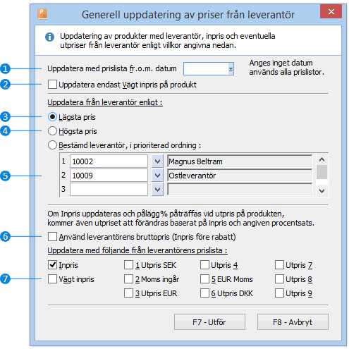 Väljs detta alternativ uppdateras enbart det vägda inpriset, inga andra priser eller leverantörsuppgifter förändras. Kryssalternativen under Uppdatera med följande från leverantörens prislista döljs när Uppdatera endast Vägt inpris väljs, dessa kommer inte att användas inte att användas vid uppdateringen.