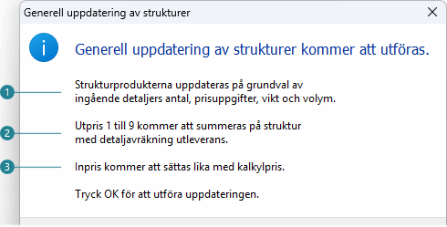 Själva uppdateringen av strukturprodukter utförs i sista steget enligt de villkor som tidigare har visats i dialogen med avseende på kostnad, vikt och eventuella utpriser samt kalkylpris. Uppdateringen sker i då på grundval av strukturernas inbördes relativa nivåer, d.v.s. om en struktur innehåller ytterligare en struktur, kommer kostnaden för denna i sin tur att ligga till grund för den övergripande strukturen o.s.v.