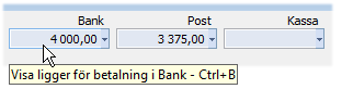 Ovan i skärmbilden visas summering av fakturor som ligger för betalning uppdelat per betalningssätten Bank, Post och Kassa. Notera att summan baseras på beloppet som ligger för betalning. D.v.s. att har en tidigare delbetalning av fakturan gjorts kommer detta belopp inte att räknas med, till skillnad från uppgiften Betalt belopp i skärmlistan som visar summan av betalningarna på fakturan.