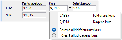 Vid handel med utrikes kunder och betalning i annan valuta kan valutakursen ha förändrats sedan försäljning och en kurs för betalning anges. Kontrollera att kursen stämmer om kunden har betalat i utländsk valuta. Korrigeras kursen kommer det att uppstå en valutadifferens. Valutadifferensen konteras på det konto som finns angivet i Inställningar Allmänt.