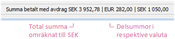 Statusraden visar normalt summa betalt med eventuella avdrag i systemvalutan (SEK). Om utländska valutor samtidigt förekommer vid inbetalningen, kommer de olika valutorna som inbetalas att summeras per valuta.