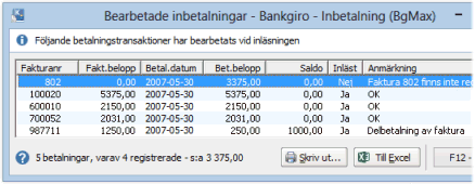 Rapporten Bearbetade inbetalningar som visas efter inläsningen verifierar att alla betalningar har registrerats korrekt. Rapporten visar då fakturanr, belopp och om transaktionen är inläst samt en eventuell anmärkning.