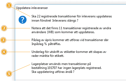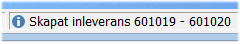 Om inleveransbokföring används kommer ett eller flera skapade inleveransnummer beroende på antalet berörda leverantörer att visas i statusraden efter att uppdateringen har slutförts.