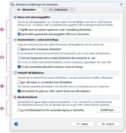 I inställningar för blanketter görs generella inställningar för alla blanketter med avseende på inköp och försäljning. Följande blanketter påverkas av dessa inställningar: