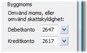 Vid inköp av svenska leverantörer (med landskod SE) kan leverantören fr.o.m. 1:a juli 2007 vara satt till momskod B (Byggmoms). I detta fall betraktas inköpet som momsfritt vid registrering av leverantörsfakturan och en fiktiv kontering kommer att skapas motsvarande Fiktiv moms varuinköp EU beskriven ovan.