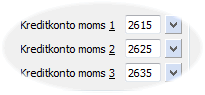 Ange Moms % (t.ex. 25%), Debetkonto (t.ex. konto 2645) och Kreditkonto (t.ex. konto 2615) i respektive fält. I avsnittet Momsrapport i bokföringen anges konto för utgående moms och ingående moms på varuförvärv från EU-land på avsedd rad. Vid utskrift av Momsrapport kommer saldo som finns på respektive konto att redovisas. |