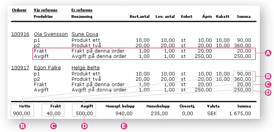 Om Samfakturering används med flera order på varje faktura kan varje order vara belagd med frakt och avgift. Genom att ange en produkt för varje begrepp man önskar redovisa på fakturan, utgör raderna en specifikation av de avgifter som ingår på varje enskild order.