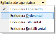 Exkluderade lagerplatser. Om exkluderade lagerplatser används kommer lagersaldot på en exkluderad lagerplats aldrig att användas på produkten. I de fall t.ex. orderantal finns på lagerplatsen kan även orderantal exkluderas från produkten. Detta kan vara fallet när försäljning av en vara sker från ett konsignationslager / varuhus och ordern registreras på den exkluderade lagerplatsen.