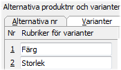 Här sker registrering av rubriker till Alternativa produktnummer vilka gör det möjligt att använda ett eller flera alternativa nummer förutom det ordinarie produktnumret.