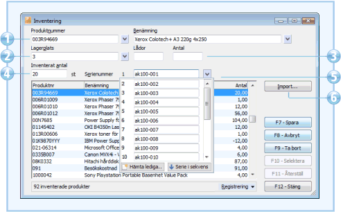 Om produkt är markerad för Serienummer kommer också fält för serienummer att finnas tillgängliga för eventuell registrering. Antal serienummer som kan registreras är då samma som det inventerade antalet, alltså ett serienummer per styck.