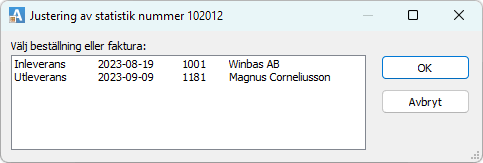 Om det finns flera matchningar med t.ex. både en tidigare beställning och faktura med samma nummer, väljs den som ska justeras i listan som visas i dialogen.