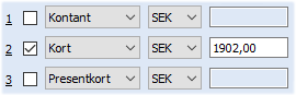 Betalningen kan delas upp på tre olika betalningssätt och genom att ange ett belopp på annat betalningssätt som återfinns på andra raden, kommer detta belopp att dras från första betalningen.