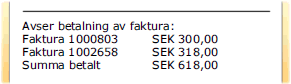 Vid delbetalning eller betalning av flera fakturor skrivs inte de ordinarie summaraderna från fakturan på kvittot utan istället det belopp som har betalats. |