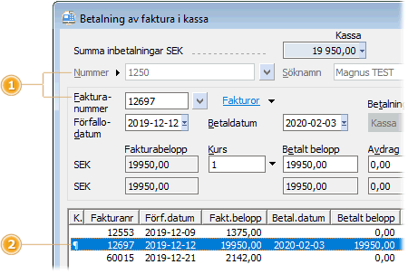 Av säkerhetsskäl kan enbart fakturor på samma kund betalas samtidigt. När en faktura har registrerats för betalning i kassa på en kund, kommer inte annan kund därefter att kunna väljas.