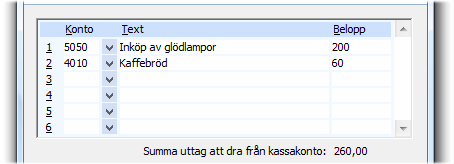 Övriga kontantuttag används när pengar ska tas från kassan vid t.ex. någon form av inköp, förskott eller liknande. Ett eller flera rader kan registreras i uttaget och konto, text och belopp för anges varje enskild post i uttaget.
