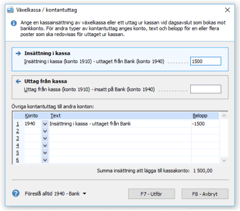 Både insättning och uttag kommer att lägga sig på första raden i listan som en transaktion på bankkonto 1940, om ytterligare kontantuttag ska registreras - kompletteras listan med övriga kontantuttag till andra konton: