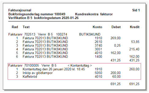 I fakturajournalen kommer kontantuttaget att specificeras i den höga nummerserien över ordinarie kontantnotor och fakturor.