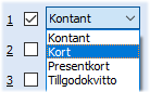 I den avancerade vyn väljs betalningssätt Kort i listan med betalningssätt. Kassaoperatören kan då välja alternativet Kort i det första aktiverade betalningssättet genom att fälla ner rullningslisten. Man kan även aktivera det andra betalningssättet där kort alltid är förvalt (Alt+2 eller klick på krysset). |
