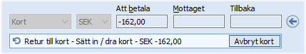 Avbryt kort. Om kortköp pågår men av någon anledning ska avbrytas, kan det pågående köpet avbrytas på terminalen eller från kassan med knappen Avbryt kort.
