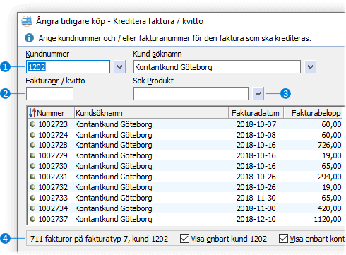 Funktionen innebär alltså ett återköp och en teckenvändning av ingående antal på kvittot som på detta sätt skapar en omvänd kopia av kvittot. Om hela köpet ska krediteras behåller man alla rader efter att funktionen har utförts, annars tas eventuella rader bort som inte är returer, och ej heller ska krediteras.