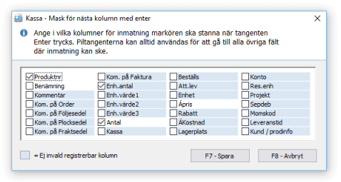 Kolumner som är registrerbara, men som för tillfället inte är invalda i skärmlistan visas med skuggad bakgrund. Dessa kolumner kan ändå väljas, men kommer inte att aktiveras för inmatning förrän de har valts in i skärmlistan. För ytterligare information om vilka kolumner som kan väljas in i Kassa se avsnittet Kolumner och fält.