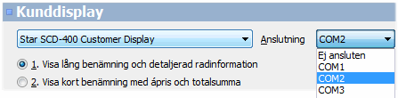 Ansluta kunddisplay Välj först vilken typ av kunddisplay som är ansluten till datorn, standardalternativet är STAR SCD-400 Customer Display. Om istället någon av Star SCD122U Customer Display eller HP ap5000 VFD Display är ansluten anges detta i dialogen. |
