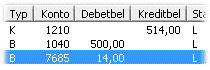 När betalningen har sparats och konteringen öppnas har konteringen för betalningen delats upp med avgiften på det angivna kontot. |