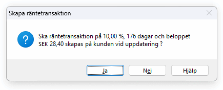 Dialogen visas om inställningen Skapa räntetransaktion vid inbetalning är ställd till Skapa efter fråga. Vid alternativet Skapa alltid kommer istället räntetransaktioner alltid att skapas när övriga förutsättningar för detta är uppfyllda. |