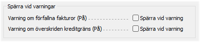 Istället för att spärra vid varningar generellt för alla kunder kan spärrar istället sättas på kunder i vissa kundgrupper. Spärrar vid varning om förfallna fakturor och överskriden kreditgräns sätts då på kundgruppen istället för i inställningar för order. |