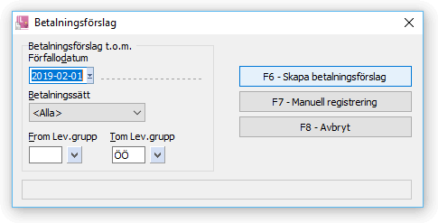 Förfallodatum. För att systemet ska skapa ett betalningsförslag automatiskt anges ett datum i fältet Förfallodatum. De fakturor som förfaller fram t.o.m. angivet datum föreslås då i betalningsförslaget.