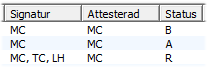 Fakturan på tredje raden ska attesteras av MC, TC och LH. Enbart MC har hittills attesterat, varför fakturans status är Registrerad, men ej attesterad (R). |