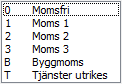 Momskod Normalt är momskoden 1 (25 %) på leverantören. Vissa leverantörer såsom försäkringsbolag (momskod 0) och liknande sätts till annan momskod såsom Momsfri. Vid Registrering av leverantörsfakturor kommer momskoden att användas för att föreslå momsbeloppet på en faktura vid registrering efter att fakturabelopp har angivits på svenska leverantörer (landskod SE). |