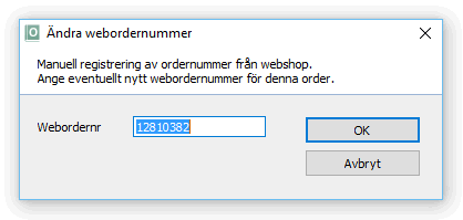 Ordernummer från webshop i Order / faktura som t.ex. visas i fönstrets namnlist efter att ordern har valts, kan läggas till eller förändras på befintlig kundorder. Numret kan t.ex. behöva läggas efter en manuell hantering av en kundorder där t.ex. xml-filen varit felaktig eller innehållit felaktigt upplagd data.