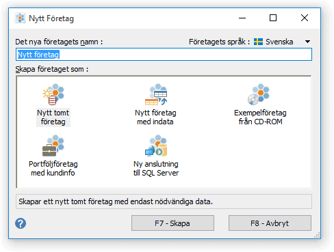 Efter att det nya företagsnamnet är angivet väljs F7 - Välj data för att vidare bestämma vilka data som ska ingå när företaget skapas. |