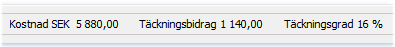 Täckningsbidrag (TB) på det beställda värdet visas i transaktionssidans statusrad tillsammans med summan av ordervärdet. Uppgifterna visas beroende på fönstrets storlek, och om andra inställningar som t.ex. om funktionen Dölj inpris, kostnad och TG används.