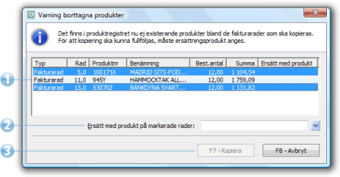 När kopiering av en offert, order, tidigare kopierad order eller faktura sker i någon av rutinerna Offertregistrering, Order / Faktura eller Kassa, kan en situation uppstå att en produkt på en ingående rad är borttagen från produktregistret. Detta kan även inträffa om kopiering sker från Beställning. Om så är fallet visas varningen om borttagna produkter, som då även erbjuder möjlighet att använda ersättningsprodukt.