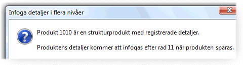 En annan skillnad blir även att vid Infoga detaljer, betraktas strukturen som infogas som tillhörande den produkt som har valts vid registrering, alltså får detaljerna den relativa undernivån i förhållande till huvudprodukten.