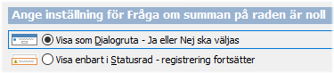 Frågan kan anpassas till att istället visas som varning med meddelande nere i statusraden. Detta innebär att knappen Ja eller Nej inte behöver tryckas i de profiler där man av olika skäl inte önskar att besvara frågan. Ett exempel kan vara vid registrering av nollorder för effektuering av lagertransaktioner.