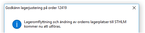 Alternativet Nej - Enbart godkännande av lageromflyttningen kan användas när man inte avser att flytta själva ordern, men ändå utföra lageromflyttningen.