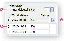 Börja med att ange antal delbetalningar (1 - 99). 1 delbetalning är standard och innebär en faktura i reskontran som vanligt, 2 eller fler innebär att delbetalning aktiveras. Ange förfallodatum respektive belopp för varje delbetalning utom den första delbetalningen som automatiskt erhåller orderns förfallodatum samt resterande belopp. |