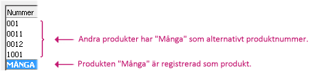 När man anger ett produktnummer som finns som vanlig produkt och även som alternativt nummer på annan produkt, visas listan med både angiven vanlig produkt samt de produkter där den finns registrerad som alternativt produktnummer.