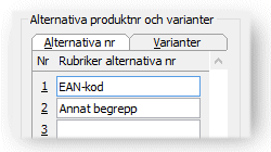 Ange först vilken eller vilka rubriker som ska användas för respektive serie för alternativa produktnummer. Dessa rubriker registreras i Inställningar produkter. Anges en rubrik, kan ett alternativt nummer registreras på produkten. Anges två rubriker finns två tillgängliga alternativa nummer på produkten o.s.v.
