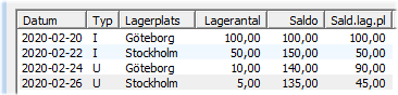 Genom att t.ex. välja in kolumnerna Lagerantal och Saldo kan produktens lagersaldo återspeglas vid tillfället för transaktionen. Kolumnen Saldo visar löpande summering baserat på inventering, inleveranser och utleveranser för lagerartiklar.